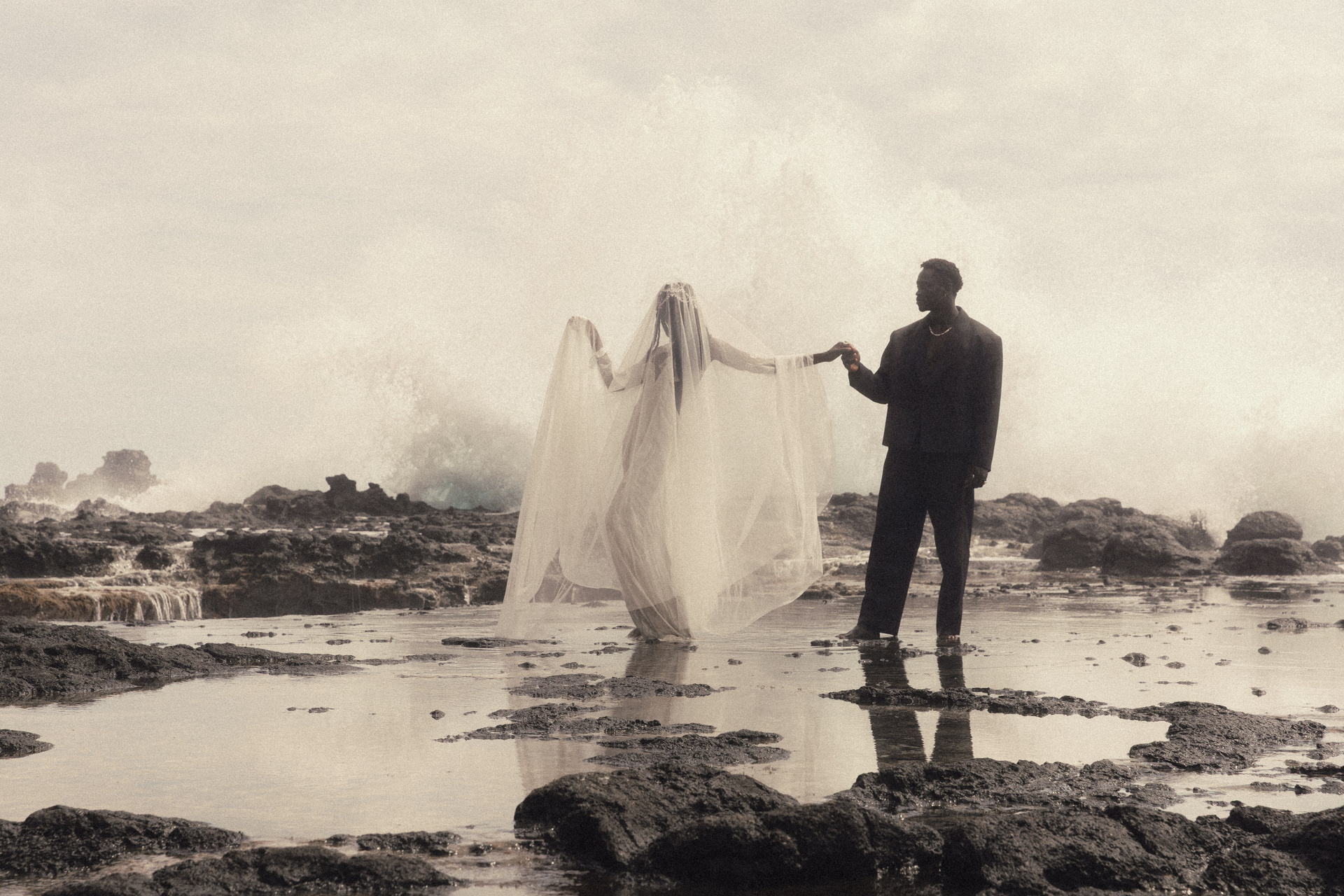 Ocean-Inspired Pre-Wedding Session in Kauai, Hawaii with Honna and Morjan, surrounded by raw coastal landscapes, tidepools, and open views.