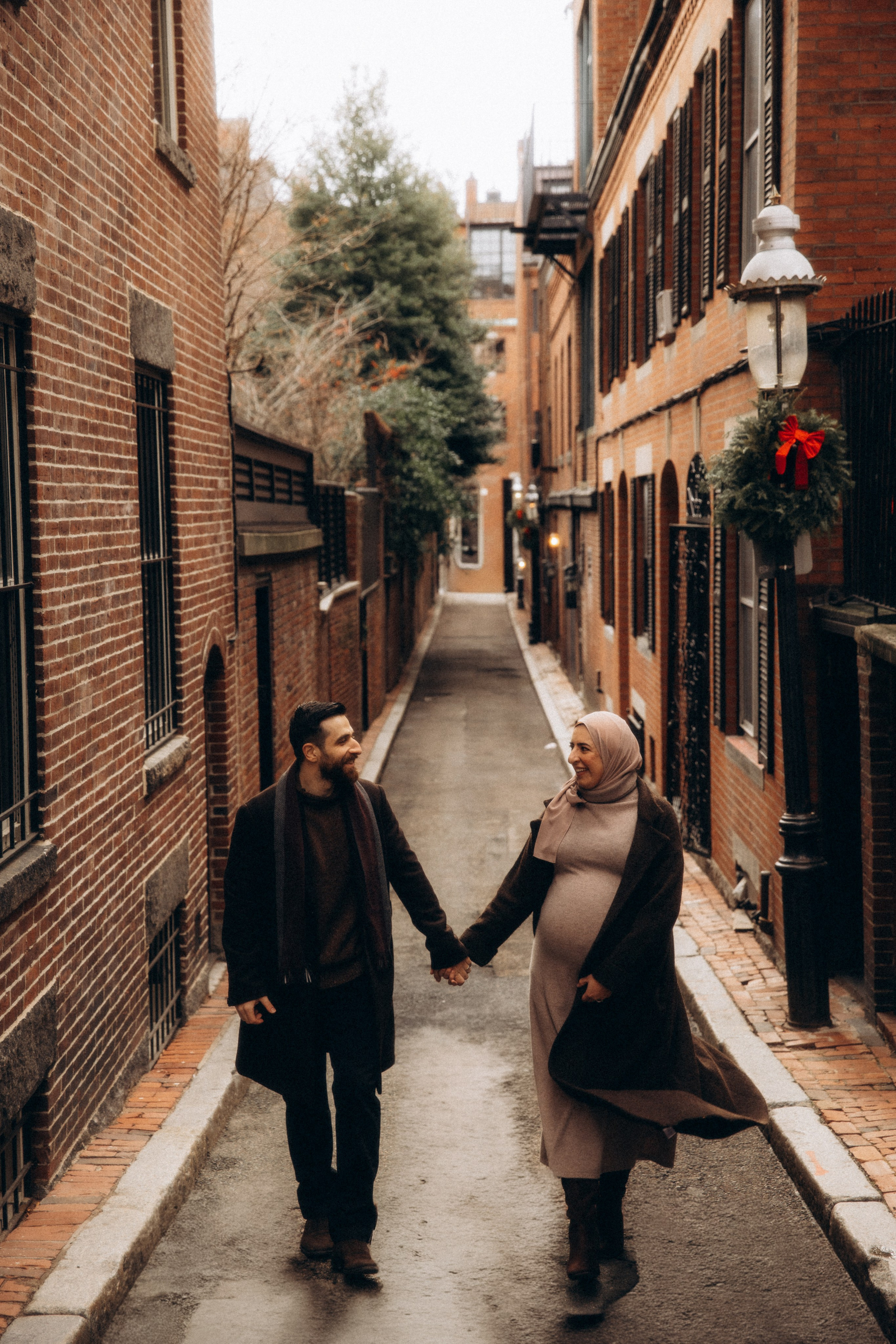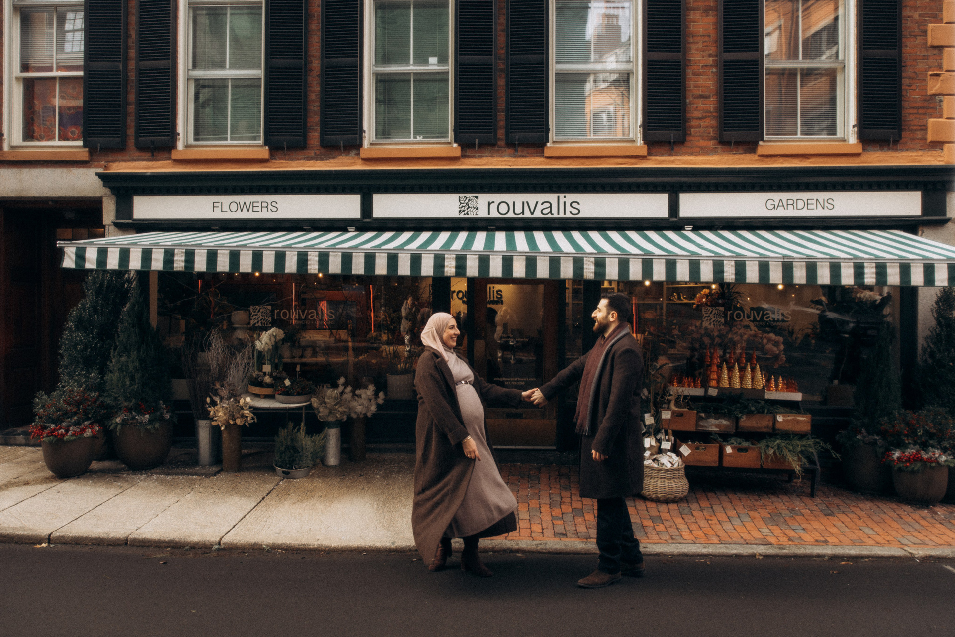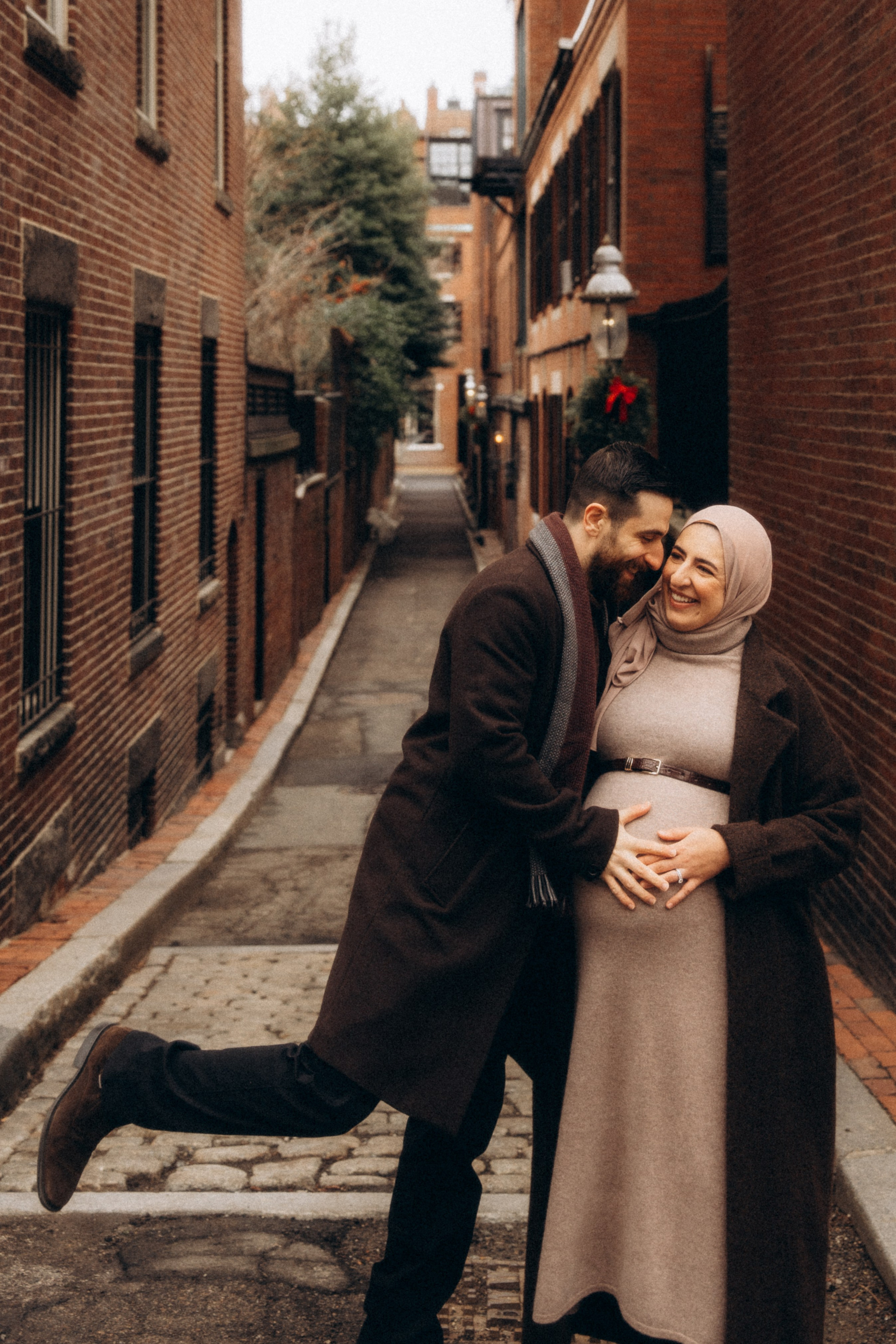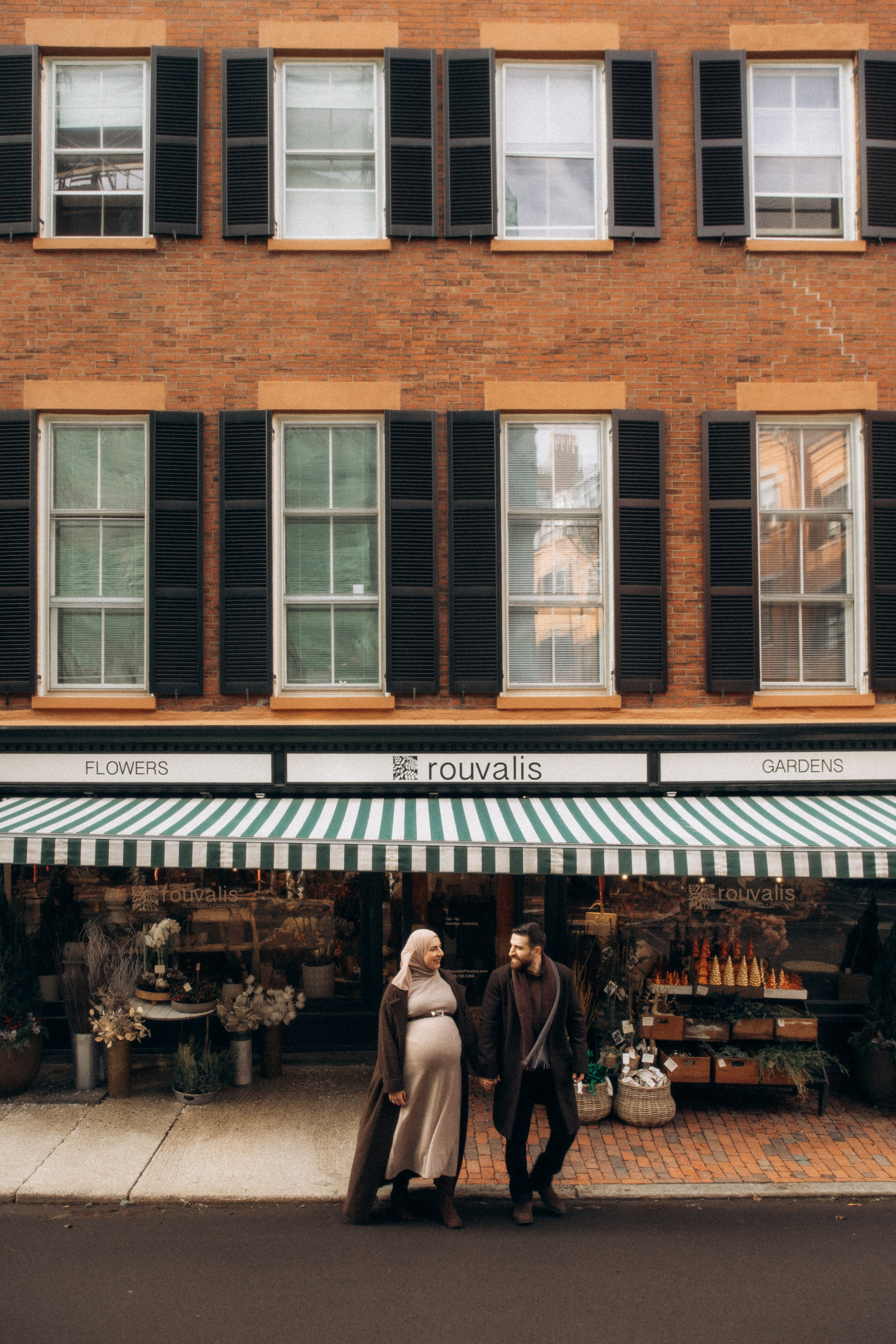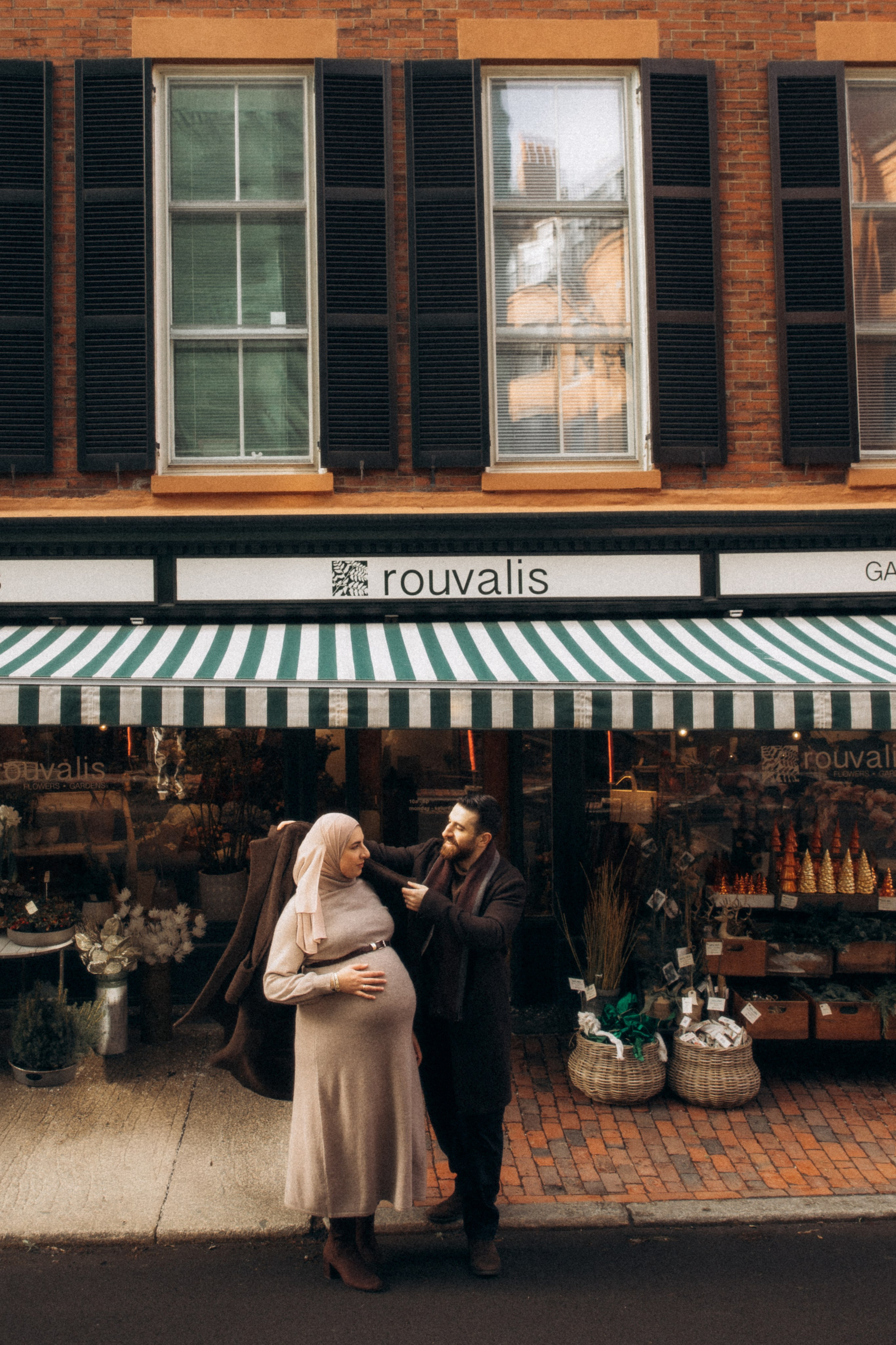 A winter maternity couples photoshoot in Boston, featuring Beacon Hill Books & Café, a romantic walk through Beacon Hill, and a cozy baby announcement over hot chocolate at La Burdick in Back Bay.