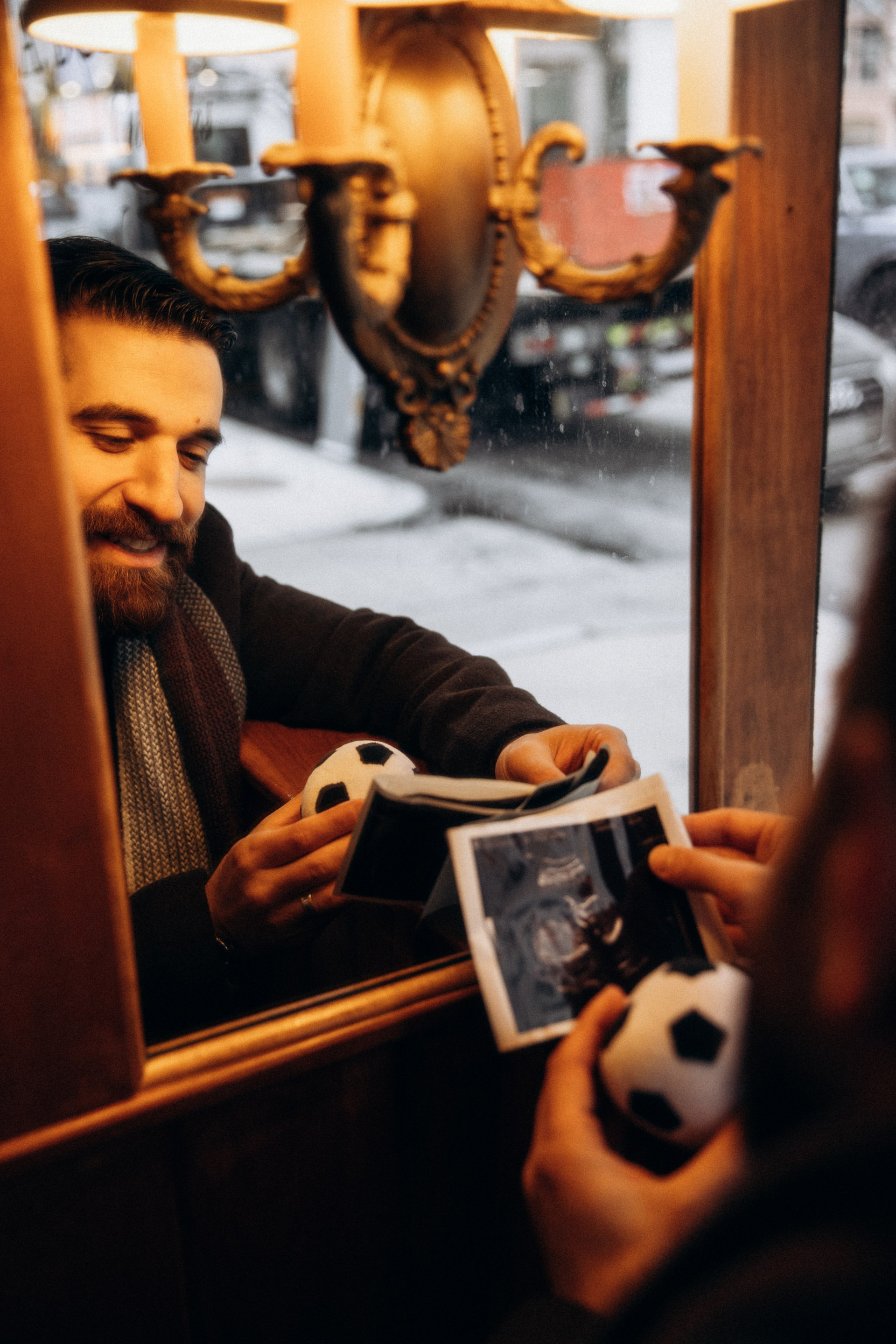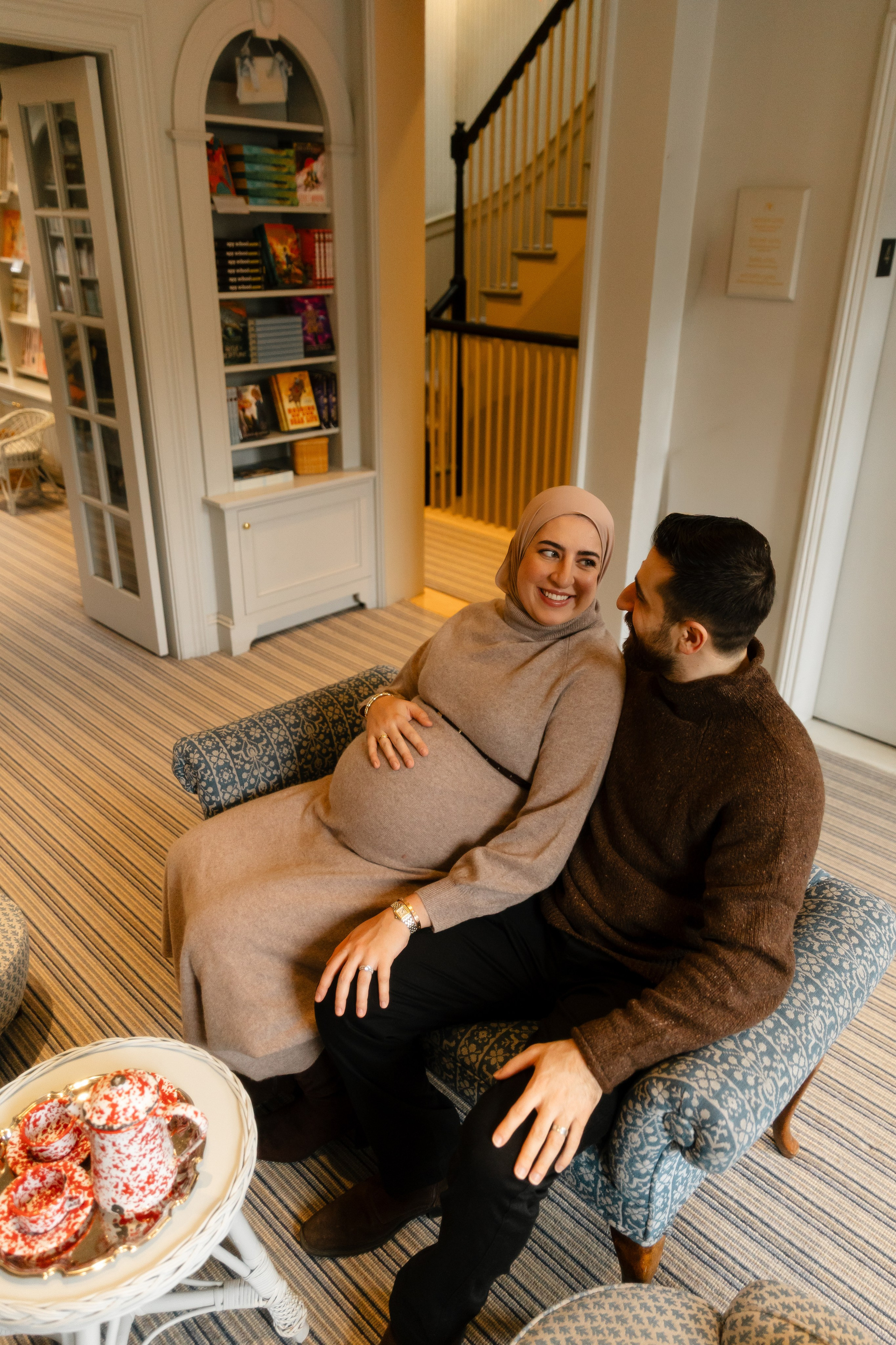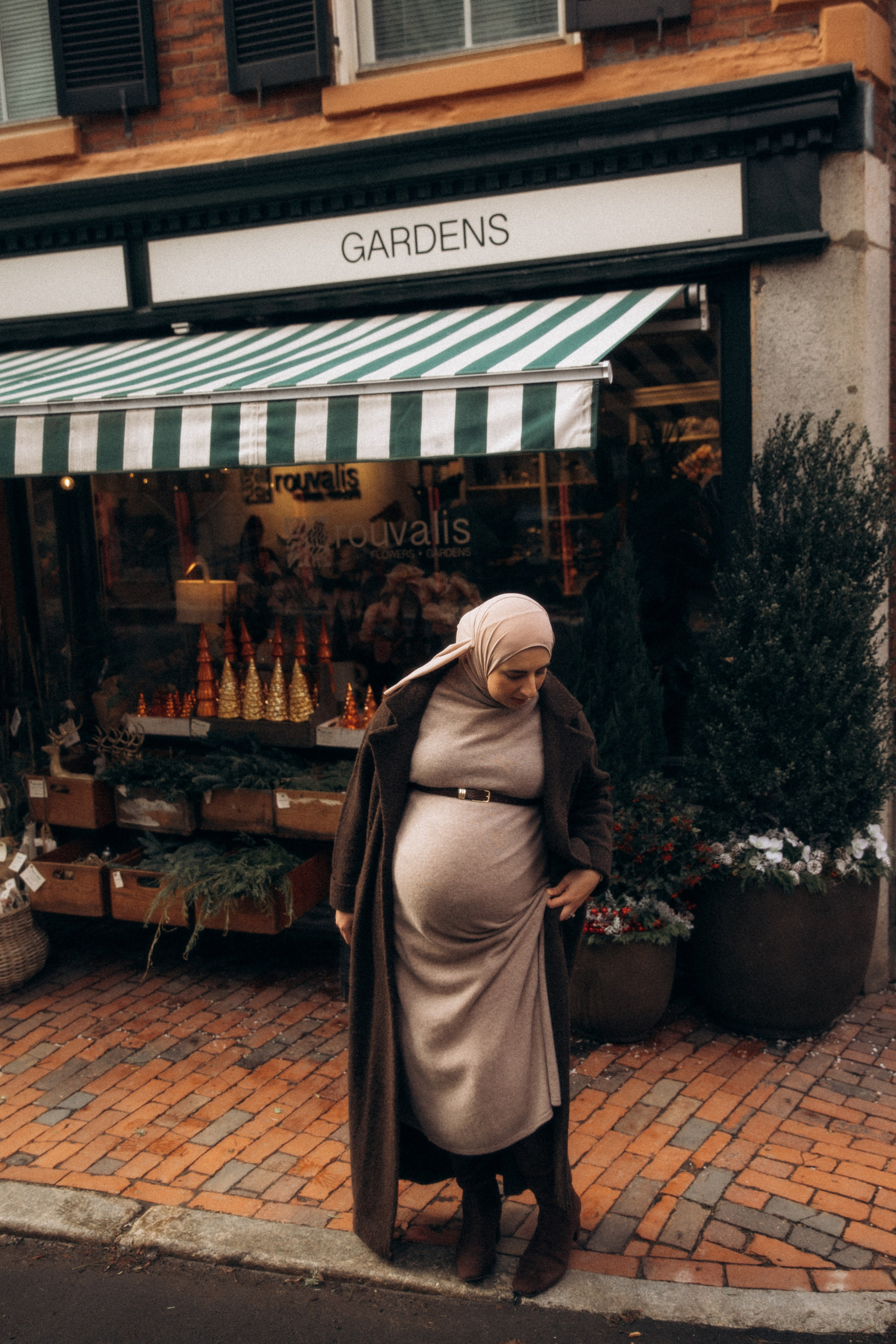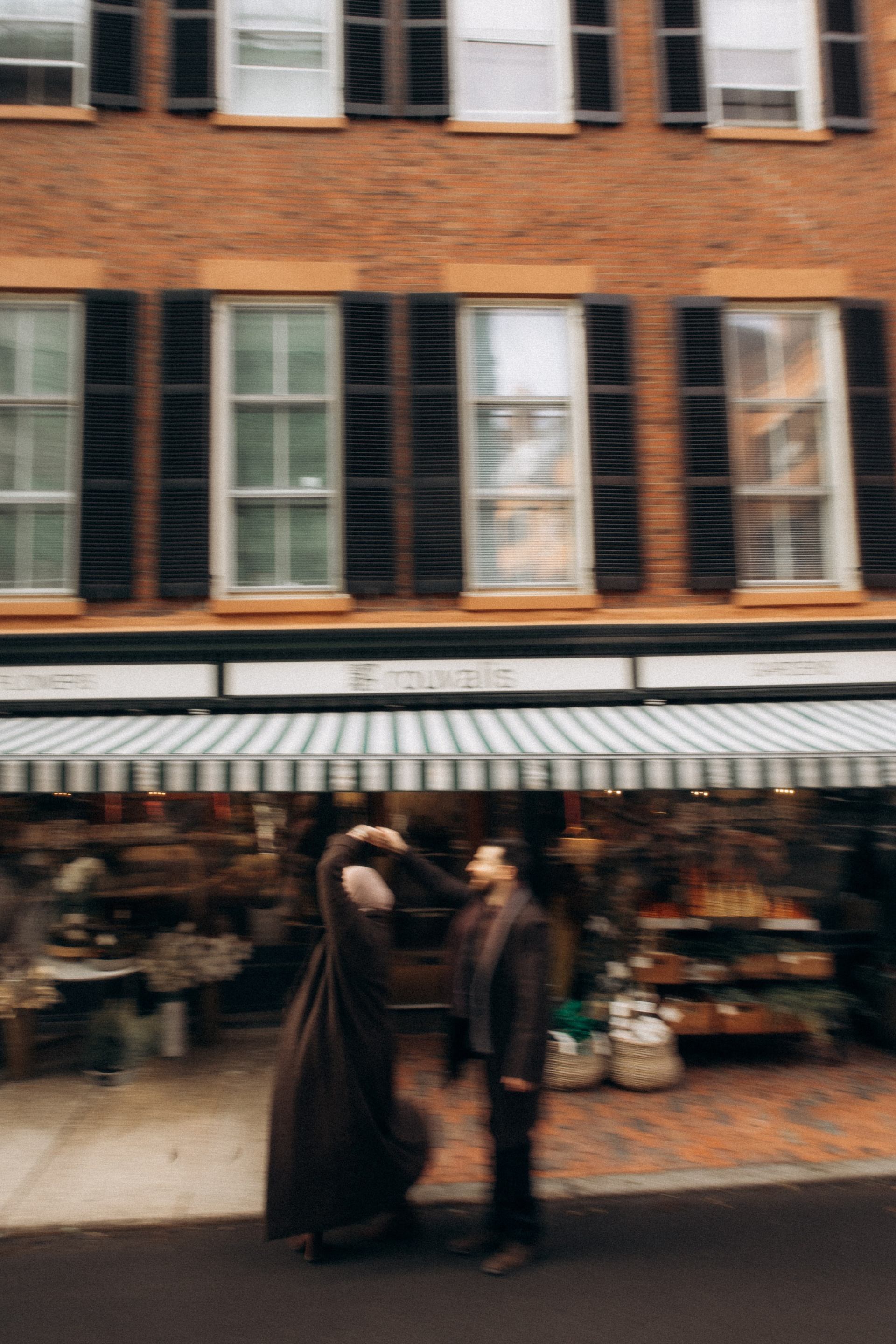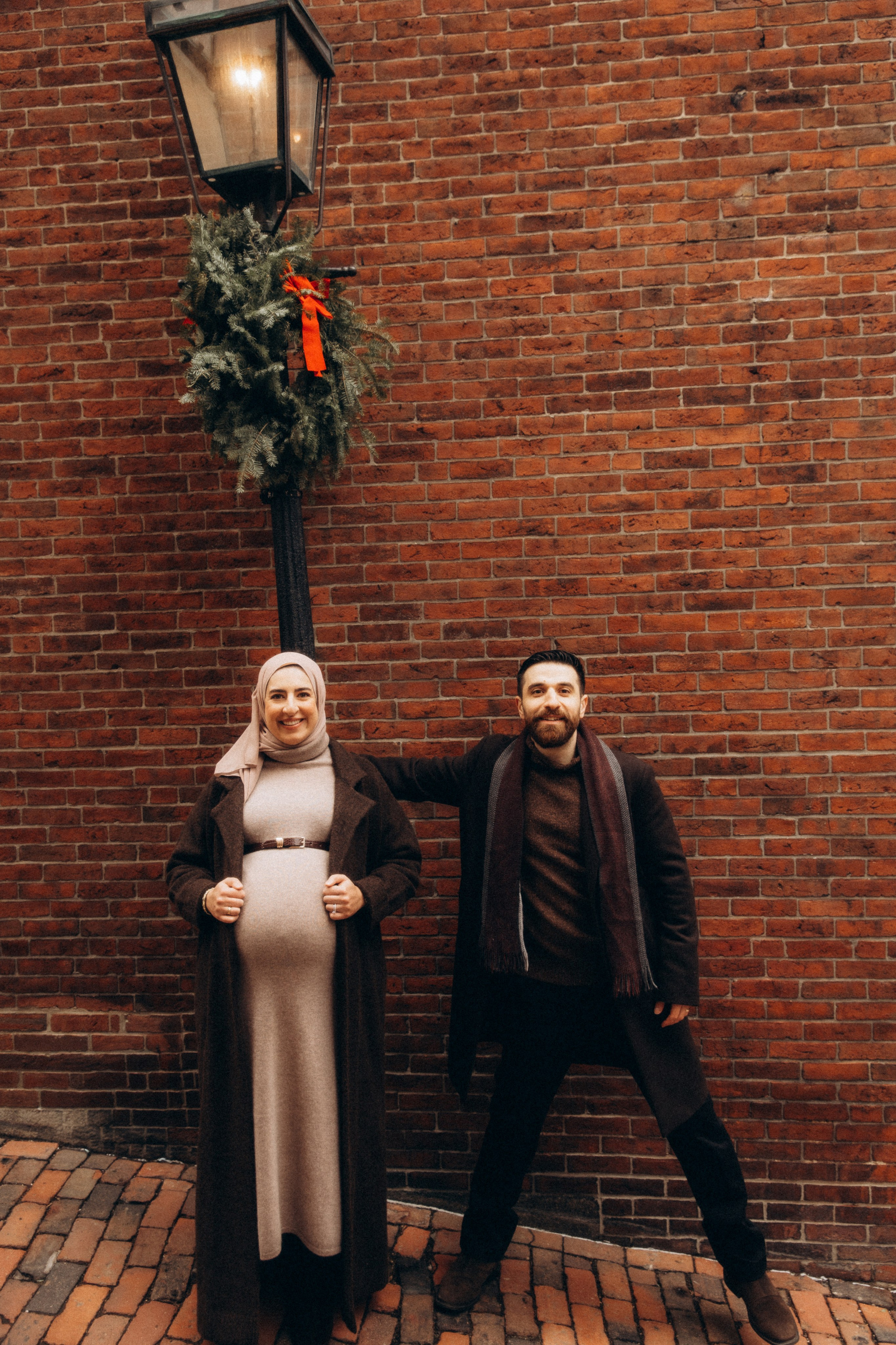 A winter maternity couples photoshoot in Boston, featuring Beacon Hill Books & Café, a romantic walk through Beacon Hill, and a cozy baby announcement over hot chocolate at La Burdick in Back Bay.