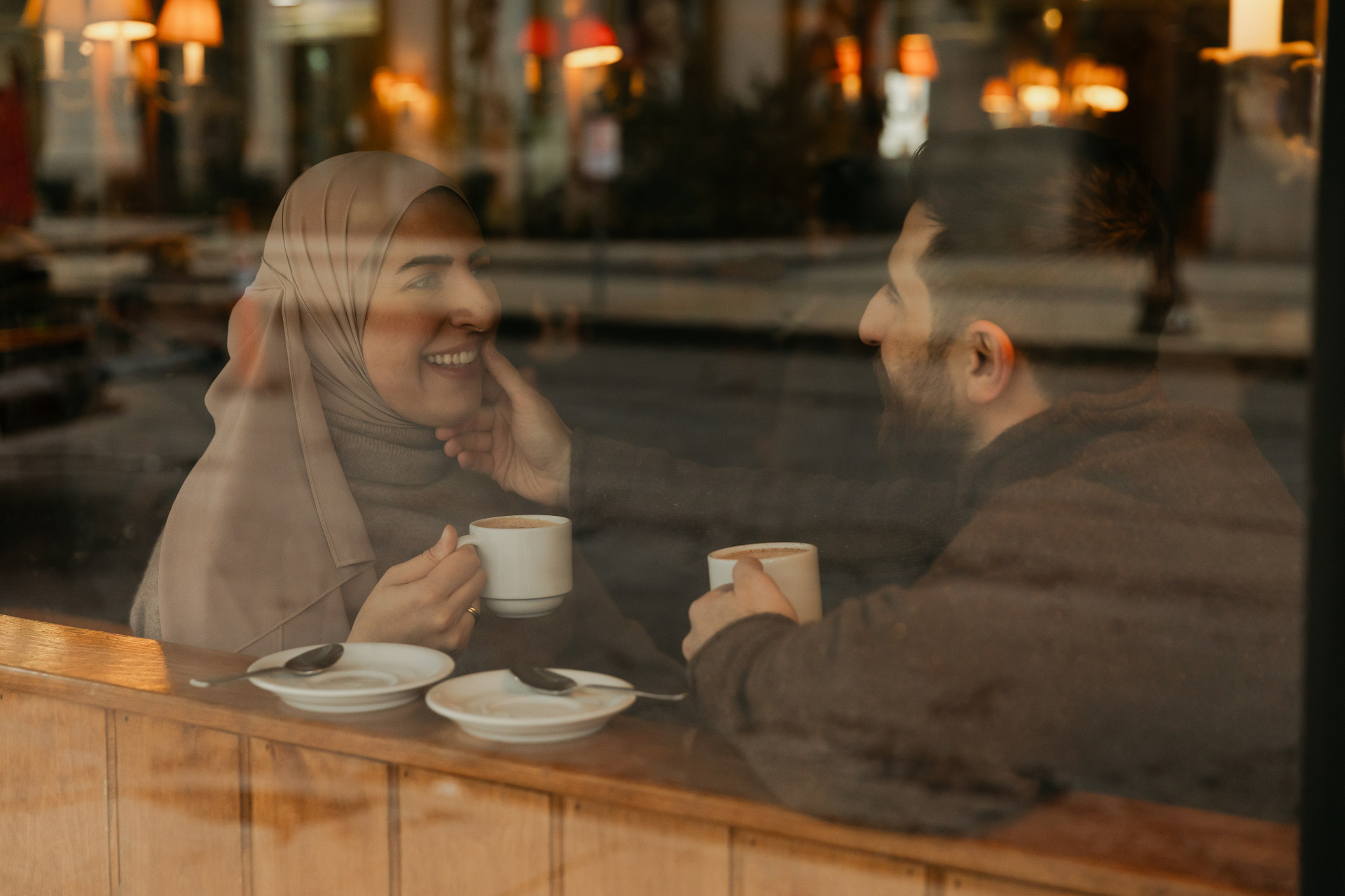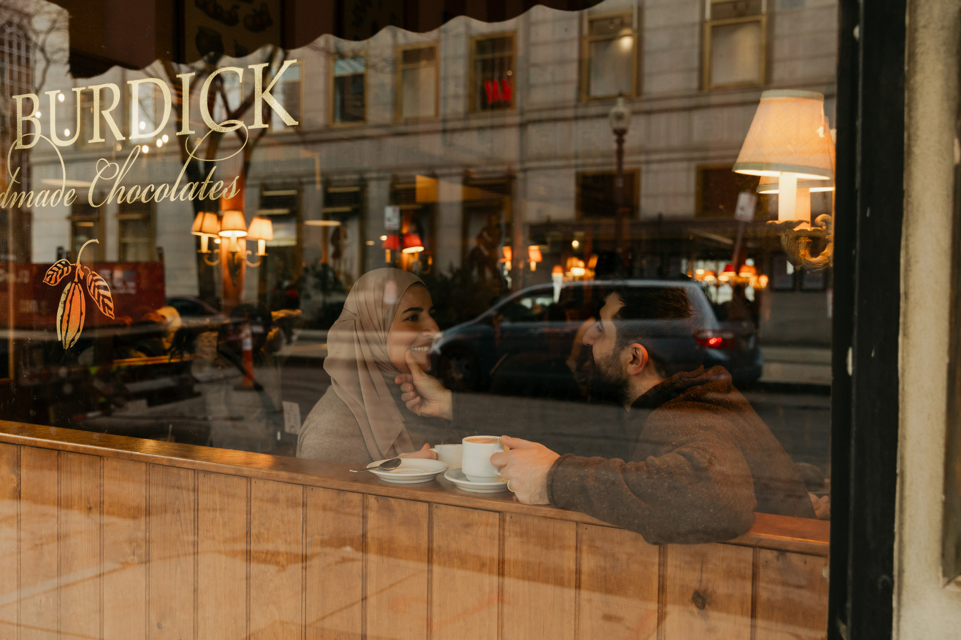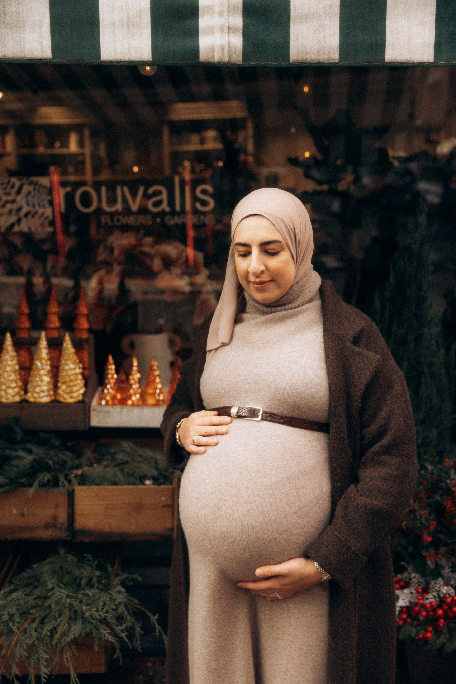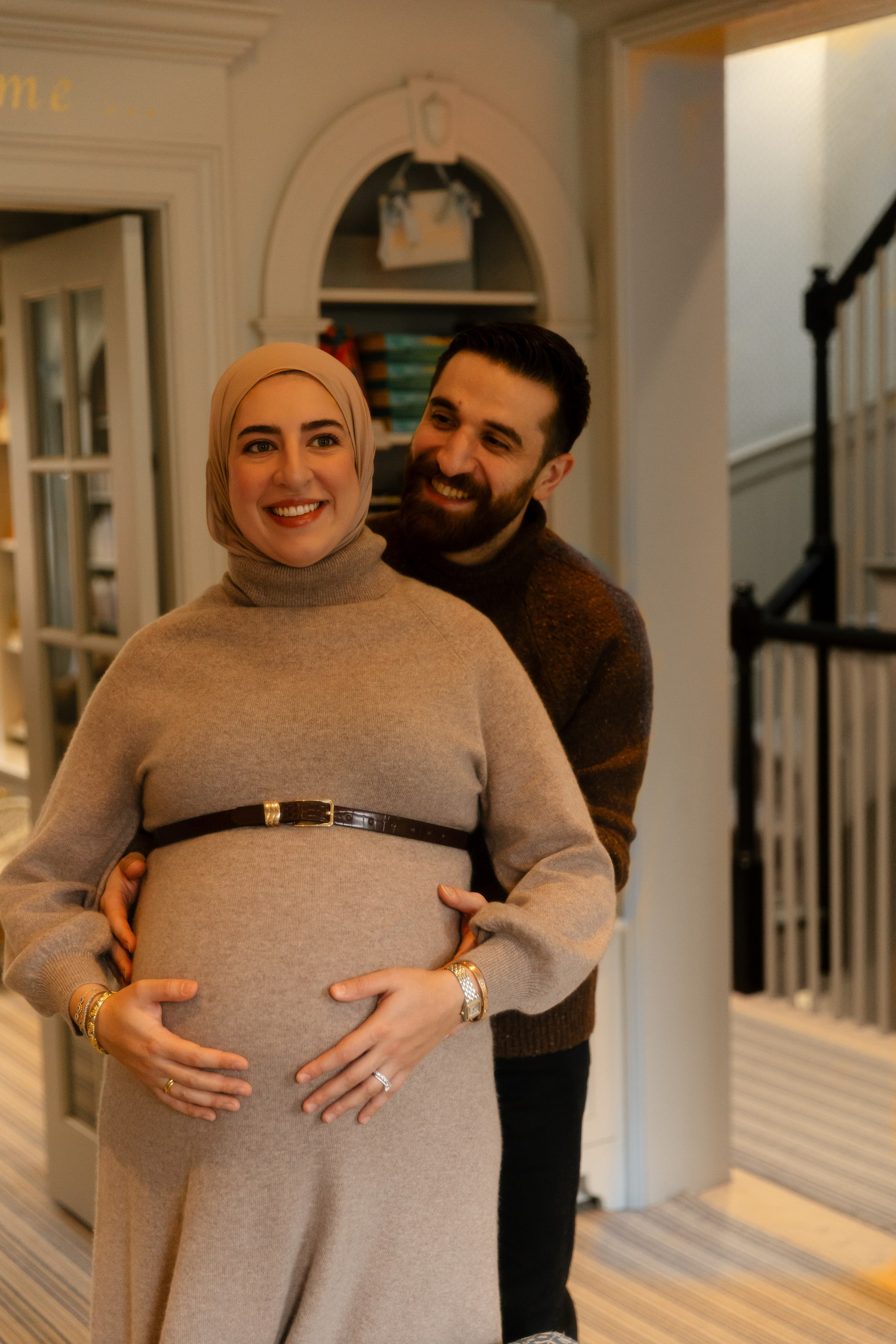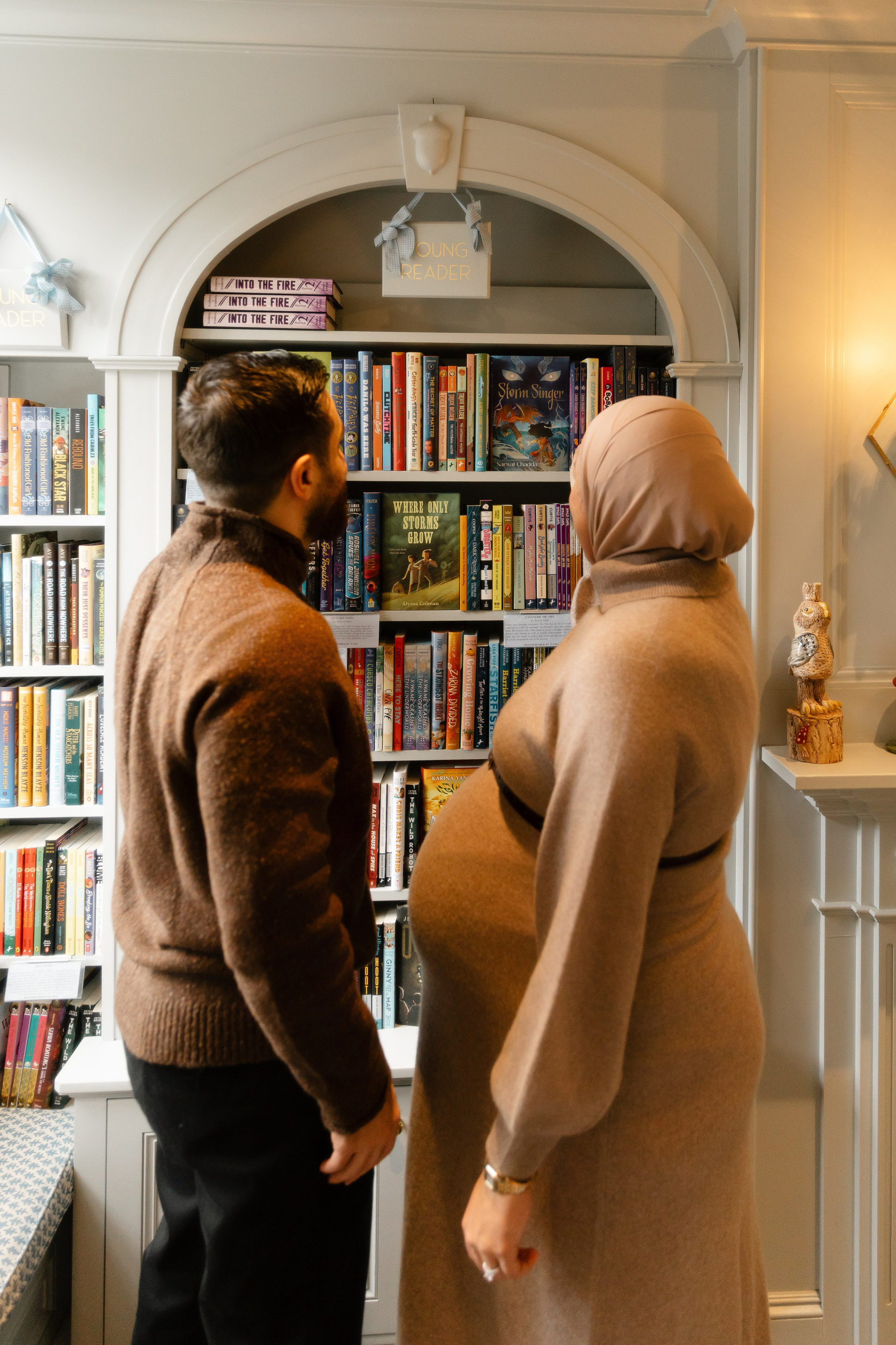 A winter maternity couples photoshoot in Boston, featuring Beacon Hill Books & Café, a romantic walk through Beacon Hill, and a cozy baby announcement over hot chocolate at La Burdick in Back Bay.