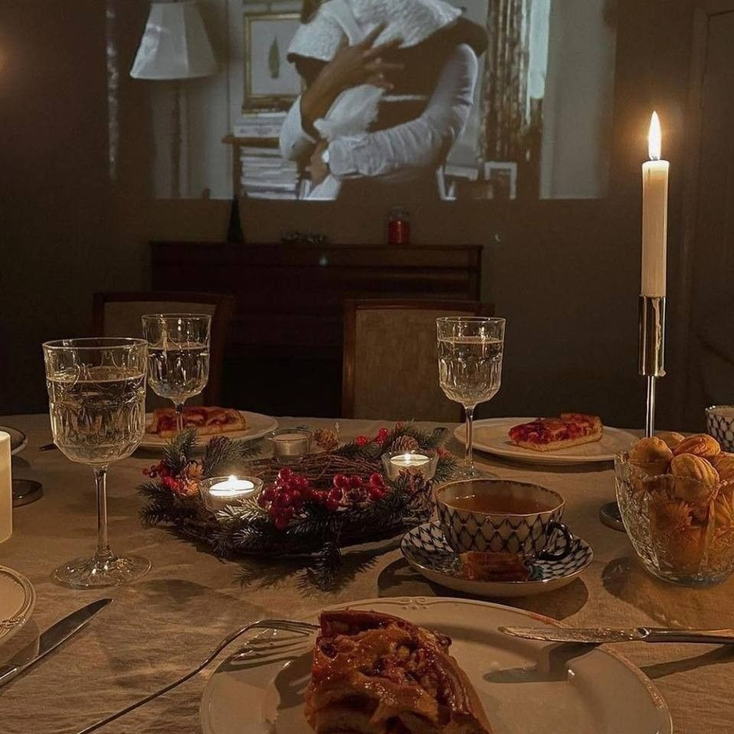 5. Christmas Dinner. A simple Christmas-style dinner setup — candles, warm lights, cozy plates, and the two of you sharing a quiet moment at the table.